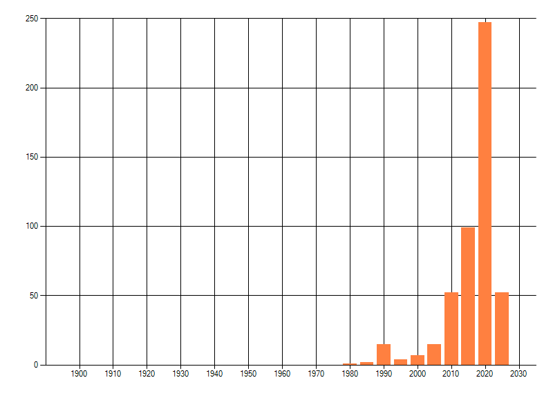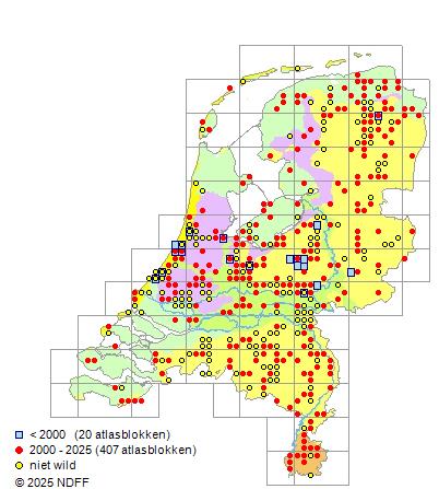 Het aantal atlasblokken (5x5 km) waarin de soort is gemeld binnen een periode van vijf jaar (vanaf 1980) of twintig jaar. Niet gecorrigeerd voor waarnemersinspanning en het aantal doorgegeven waarnemingen kan sterk variëren per periode, dus een trend in verspreiding kan hier niet direct uit worden afgelezen. Het opgegeven jaartal is het eerste jaar van de periode. Bron: gevalideerde waarnemingen uit de NDFF.