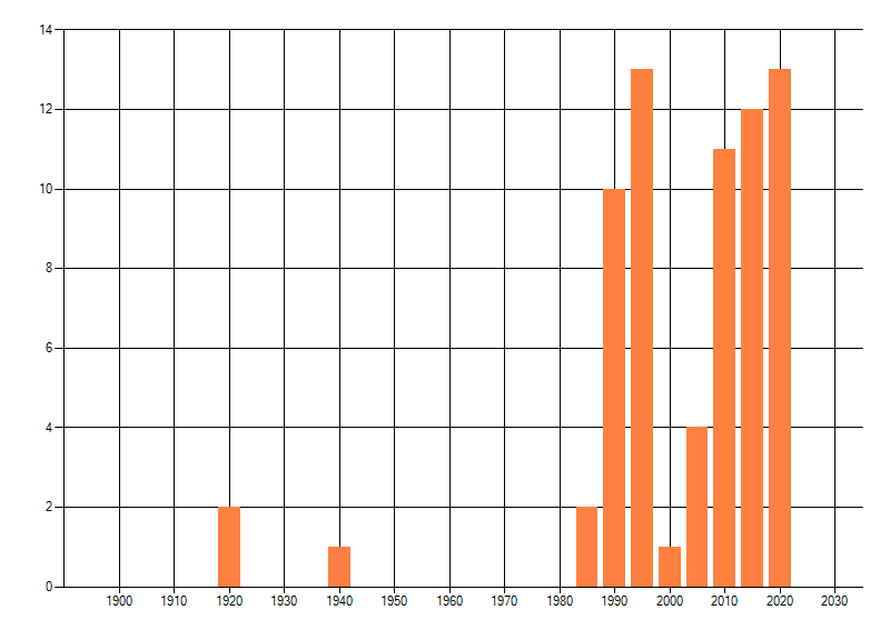 Het aantal atlasblokken (5x5 km) waarin de soort is gemeld binnen een periode van vijf jaar (vanaf 1980) of twintig jaar. Niet gecorrigeerd voor waarnemersinspanning en het aantal doorgegeven waarnemingen kan sterk variëren per periode, dus een trend in verspreiding kan hier niet direct uit worden afgelezen. Het opgegeven jaartal is het eerste jaar van de periode. Bron: gevalideerde waarnemingen uit de NDFF.