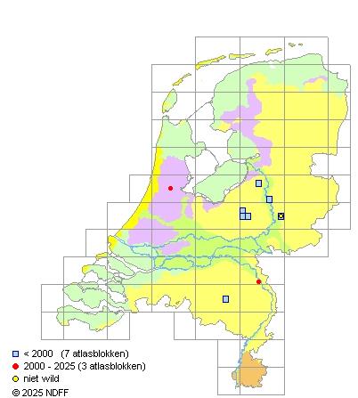 Het aantal atlasblokken (5x5 km) waarin de soort is gemeld binnen een periode van vijf jaar (vanaf 1980) of twintig jaar. Niet gecorrigeerd voor waarnemersinspanning en het aantal doorgegeven waarnemingen kan sterk variëren per periode, dus een trend in verspreiding kan hier niet direct uit worden afgelezen. Het opgegeven jaartal is het eerste jaar van de periode. Bron: gevalideerde waarnemingen uit de NDFF.