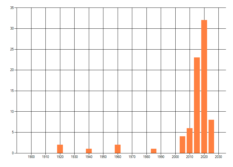 Het aantal atlasblokken (5x5 km) waarin de soort is gemeld binnen een periode van vijf jaar (vanaf 1980) of twintig jaar. Niet gecorrigeerd voor waarnemersinspanning en het aantal doorgegeven waarnemingen kan sterk variëren per periode, dus een trend in verspreiding kan hier niet direct uit worden afgelezen. Het opgegeven jaartal is het eerste jaar van de periode. Bron: gevalideerde waarnemingen uit de NDFF.