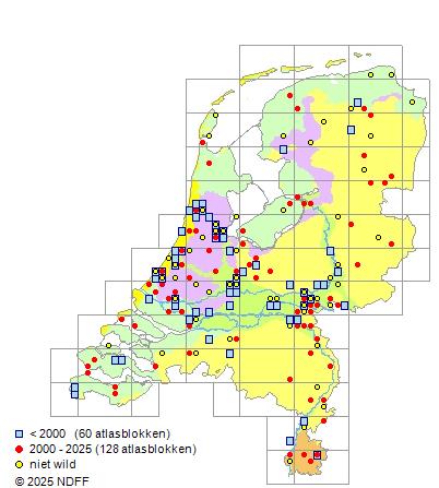 Het aantal atlasblokken (5x5 km) waarin de soort is gemeld binnen een periode van vijf jaar (vanaf 1980) of twintig jaar. Niet gecorrigeerd voor waarnemersinspanning en het aantal doorgegeven waarnemingen kan sterk variëren per periode, dus een trend in verspreiding kan hier niet direct uit worden afgelezen. Het opgegeven jaartal is het eerste jaar van de periode. Bron: gevalideerde waarnemingen uit de NDFF.
