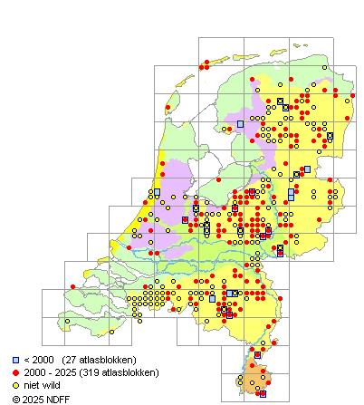 Het aantal atlasblokken (5x5 km) waarin de soort is gemeld binnen een periode van vijf jaar (vanaf 1980) of twintig jaar. Niet gecorrigeerd voor waarnemersinspanning en het aantal doorgegeven waarnemingen kan sterk variëren per periode, dus een trend in verspreiding kan hier niet direct uit worden afgelezen. Het opgegeven jaartal is het eerste jaar van de periode. Bron: gevalideerde waarnemingen uit de NDFF.