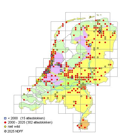Het aantal atlasblokken (5x5 km) waarin de soort is gemeld binnen een periode van vijf jaar (vanaf 1980) of twintig jaar. Niet gecorrigeerd voor waarnemersinspanning en het aantal doorgegeven waarnemingen kan sterk variëren per periode, dus een trend in verspreiding kan hier niet direct uit worden afgelezen. Het opgegeven jaartal is het eerste jaar van de periode. Bron: gevalideerde waarnemingen uit de NDFF.