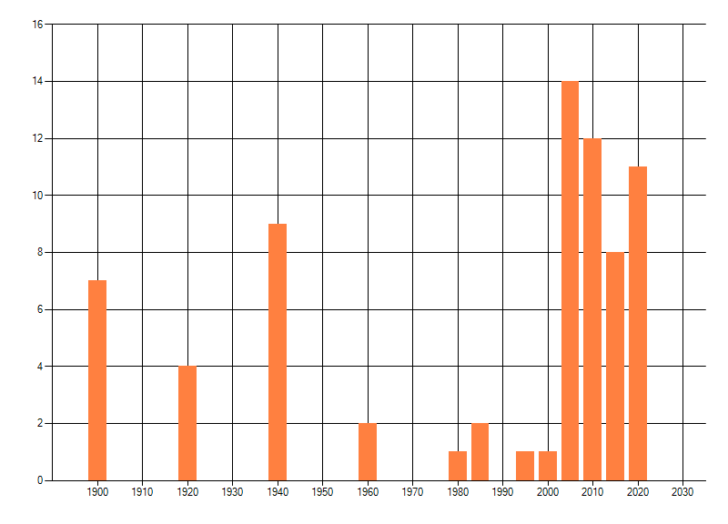 Het aantal atlasblokken (5x5 km) waarin de soort is gemeld binnen een periode van vijf jaar (vanaf 1980) of twintig jaar. Niet gecorrigeerd voor waarnemersinspanning en het aantal doorgegeven waarnemingen kan sterk variëren per periode, dus een trend in verspreiding kan hier niet direct uit worden afgelezen. Het opgegeven jaartal is het eerste jaar van de periode. Bron: gevalideerde waarnemingen uit de NDFF.