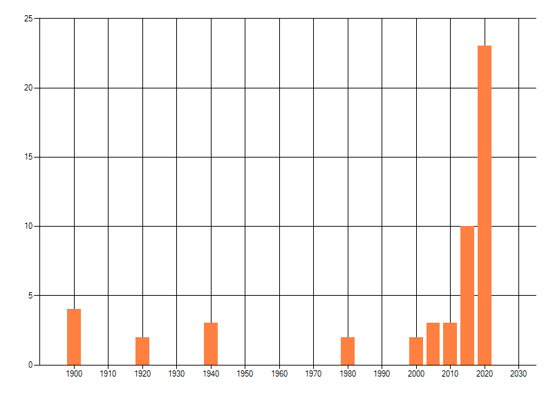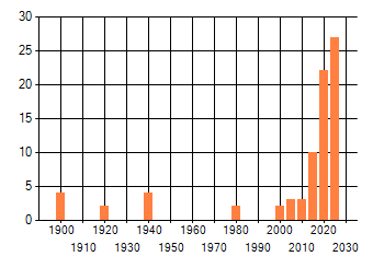 Het aantal atlasblokken (5x5 km) waarin de soort is gemeld binnen een periode van vijf jaar (vanaf 1980) of twintig jaar. Niet gecorrigeerd voor waarnemersinspanning en het aantal doorgegeven waarnemingen kan sterk variëren per periode, dus een trend in verspreiding kan hier niet direct uit worden afgelezen. Het opgegeven jaartal is het eerste jaar van de periode. Bron: gevalideerde waarnemingen uit de NDFF.