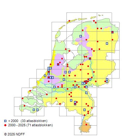 Het aantal atlasblokken (5x5 km) waarin de soort is gemeld binnen een periode van vijf jaar (vanaf 1980) of twintig jaar. Niet gecorrigeerd voor waarnemersinspanning en het aantal doorgegeven waarnemingen kan sterk variëren per periode, dus een trend in verspreiding kan hier niet direct uit worden afgelezen. Het opgegeven jaartal is het eerste jaar van de periode. Bron: gevalideerde waarnemingen uit de NDFF.