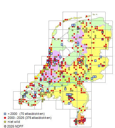 Het aantal atlasblokken (5x5 km) waarin de soort is gemeld binnen een periode van vijf jaar (vanaf 1980) of twintig jaar. Niet gecorrigeerd voor waarnemersinspanning en het aantal doorgegeven waarnemingen kan sterk variëren per periode, dus een trend in verspreiding kan hier niet direct uit worden afgelezen. Het opgegeven jaartal is het eerste jaar van de periode. Bron: gevalideerde waarnemingen uit de NDFF.