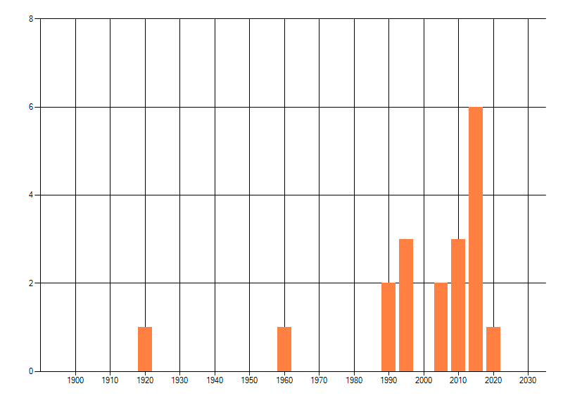 Het aantal atlasblokken (5x5 km) waarin de soort is gemeld binnen een periode van vijf jaar (vanaf 1980) of twintig jaar. Niet gecorrigeerd voor waarnemersinspanning en het aantal doorgegeven waarnemingen kan sterk variëren per periode, dus een trend in verspreiding kan hier niet direct uit worden afgelezen. Het opgegeven jaartal is het eerste jaar van de periode. Bron: gevalideerde waarnemingen uit de NDFF.
