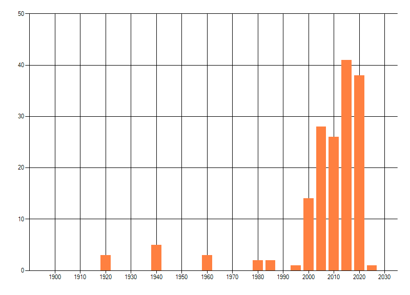 Het aantal atlasblokken (5x5 km) waarin de soort is gemeld binnen een periode van vijf jaar (vanaf 1980) of twintig jaar. Niet gecorrigeerd voor waarnemersinspanning en het aantal doorgegeven waarnemingen kan sterk variëren per periode, dus een trend in verspreiding kan hier niet direct uit worden afgelezen. Het opgegeven jaartal is het eerste jaar van de periode. Bron: gevalideerde waarnemingen uit de NDFF.