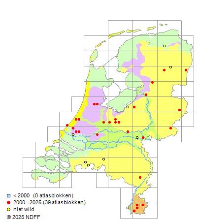 Het aantal atlasblokken (5x5 km) waarin de soort is gemeld binnen een periode van vijf jaar (vanaf 1980) of twintig jaar. Niet gecorrigeerd voor waarnemersinspanning en het aantal doorgegeven waarnemingen kan sterk variëren per periode, dus een trend in verspreiding kan hier niet direct uit worden afgelezen. Het opgegeven jaartal is het eerste jaar van de periode. Bron: gevalideerde waarnemingen uit de NDFF.