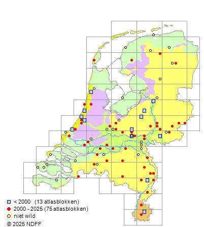 Het aantal atlasblokken (5x5 km) waarin de soort is gemeld binnen een periode van vijf jaar (vanaf 1980) of twintig jaar. Niet gecorrigeerd voor waarnemersinspanning en het aantal doorgegeven waarnemingen kan sterk variëren per periode, dus een trend in verspreiding kan hier niet direct uit worden afgelezen. Het opgegeven jaartal is het eerste jaar van de periode. Bron: gevalideerde waarnemingen uit de NDFF.