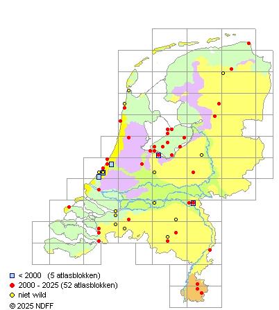 Het aantal atlasblokken (5x5 km) waarin de soort is gemeld binnen een periode van vijf jaar (vanaf 1980) of twintig jaar. Niet gecorrigeerd voor waarnemersinspanning en het aantal doorgegeven waarnemingen kan sterk variëren per periode, dus een trend in verspreiding kan hier niet direct uit worden afgelezen. Het opgegeven jaartal is het eerste jaar van de periode. Bron: gevalideerde waarnemingen uit de NDFF.