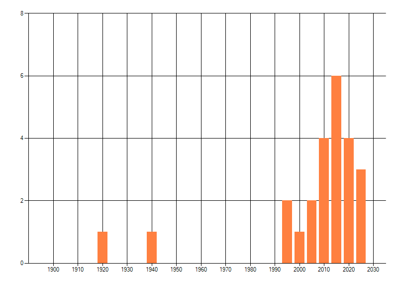 Het aantal atlasblokken (5x5 km) waarin de soort is gemeld binnen een periode van vijf jaar (vanaf 1980) of twintig jaar. Niet gecorrigeerd voor waarnemersinspanning en het aantal doorgegeven waarnemingen kan sterk variëren per periode, dus een trend in verspreiding kan hier niet direct uit worden afgelezen. Het opgegeven jaartal is het eerste jaar van de periode. Bron: gevalideerde waarnemingen uit de NDFF.