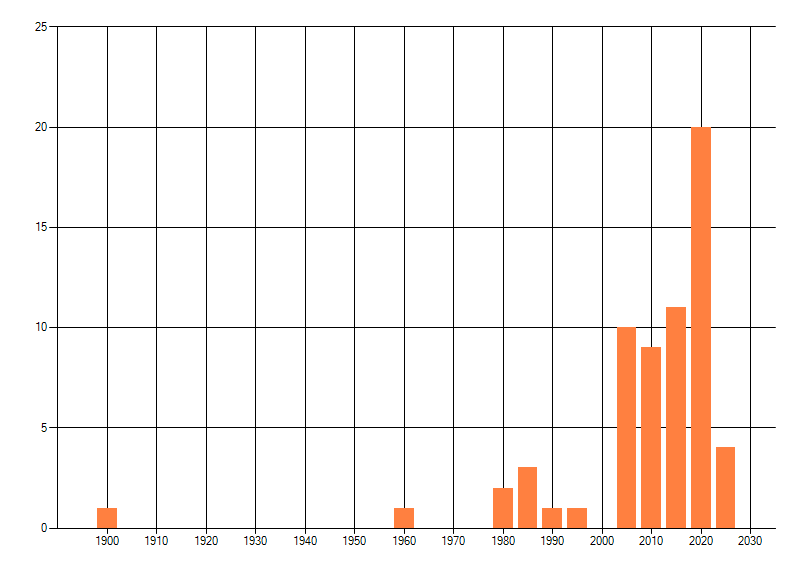 Het aantal atlasblokken (5x5 km) waarin de soort is gemeld binnen een periode van vijf jaar (vanaf 1980) of twintig jaar. Niet gecorrigeerd voor waarnemersinspanning en het aantal doorgegeven waarnemingen kan sterk variëren per periode, dus een trend in verspreiding kan hier niet direct uit worden afgelezen. Het opgegeven jaartal is het eerste jaar van de periode. Bron: gevalideerde waarnemingen uit de NDFF.