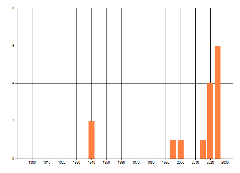 Het aantal atlasblokken (5x5 km) waarin de soort is gemeld binnen een periode van vijf jaar (vanaf 1980) of twintig jaar. Niet gecorrigeerd voor waarnemersinspanning en het aantal doorgegeven waarnemingen kan sterk variëren per periode, dus een trend in verspreiding kan hier niet direct uit worden afgelezen. Het opgegeven jaartal is het eerste jaar van de periode. Bron: gevalideerde waarnemingen uit de NDFF.