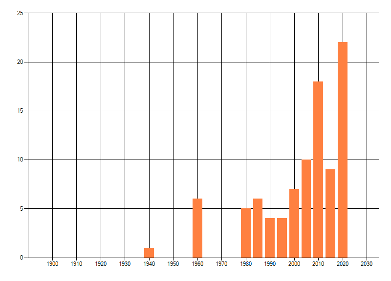Het aantal atlasblokken (5x5 km) waarin de soort is gemeld binnen een periode van vijf jaar (vanaf 1980) of twintig jaar. Niet gecorrigeerd voor waarnemersinspanning en het aantal doorgegeven waarnemingen kan sterk variëren per periode, dus een trend in verspreiding kan hier niet direct uit worden afgelezen. Het opgegeven jaartal is het eerste jaar van de periode. Bron: gevalideerde waarnemingen uit de NDFF.
