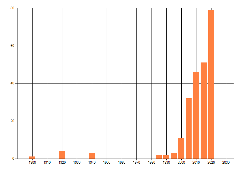 Het aantal atlasblokken (5x5 km) waarin de soort is gemeld binnen een periode van vijf jaar (vanaf 1980) of twintig jaar. Niet gecorrigeerd voor waarnemersinspanning en het aantal doorgegeven waarnemingen kan sterk variëren per periode, dus een trend in verspreiding kan hier niet direct uit worden afgelezen. Het opgegeven jaartal is het eerste jaar van de periode. Bron: gevalideerde waarnemingen uit de NDFF.