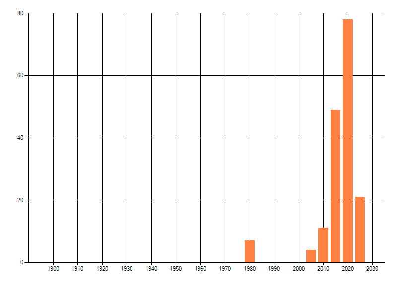 Het aantal atlasblokken (5x5 km) waarin de soort is gemeld binnen een periode van vijf jaar (vanaf 1980) of twintig jaar. Niet gecorrigeerd voor waarnemersinspanning en het aantal doorgegeven waarnemingen kan sterk variëren per periode, dus een trend in verspreiding kan hier niet direct uit worden afgelezen. Het opgegeven jaartal is het eerste jaar van de periode. Bron: gevalideerde waarnemingen uit de NDFF.