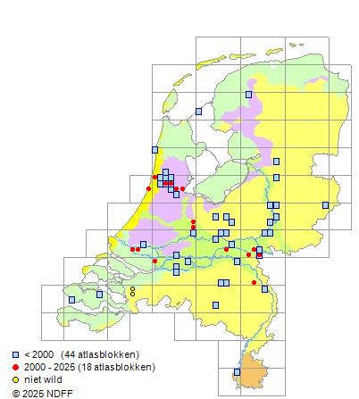 Het aantal atlasblokken (5x5 km) waarin de soort is gemeld binnen een periode van vijf jaar (vanaf 1980) of twintig jaar. Niet gecorrigeerd voor waarnemersinspanning en het aantal doorgegeven waarnemingen kan sterk variëren per periode, dus een trend in verspreiding kan hier niet direct uit worden afgelezen. Het opgegeven jaartal is het eerste jaar van de periode. Bron: gevalideerde waarnemingen uit de NDFF.