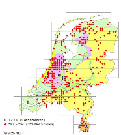 Het aantal atlasblokken (5x5 km) waarin de soort is gemeld binnen een periode van vijf jaar (vanaf 1980) of twintig jaar.