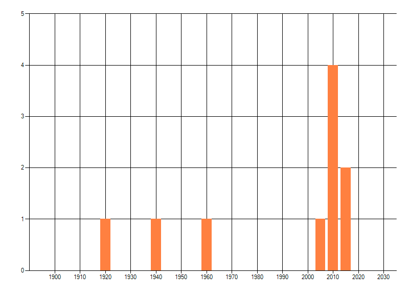 Het aantal atlasblokken (5x5 km) waarin de soort is gemeld binnen een periode van vijf jaar (vanaf 1980) of twintig jaar. Niet gecorrigeerd voor waarnemersinspanning en het aantal doorgegeven waarnemingen kan sterk variëren per periode, dus een trend in verspreiding kan hier niet direct uit worden afgelezen. Het opgegeven jaartal is het eerste jaar van de periode. Bron: gevalideerde waarnemingen uit de NDFF.