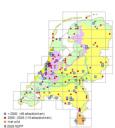 Het aantal atlasblokken (5x5 km) waarin de soort is gemeld binnen een periode van vijf jaar (vanaf 1980) of twintig jaar. Niet gecorrigeerd voor waarnemersinspanning en het aantal doorgegeven waarnemingen kan sterk variëren per periode, dus een trend in verspreiding kan hier niet direct uit worden afgelezen. Het opgegeven jaartal is het eerste jaar van de periode. Bron: gevalideerde waarnemingen uit de NDFF.