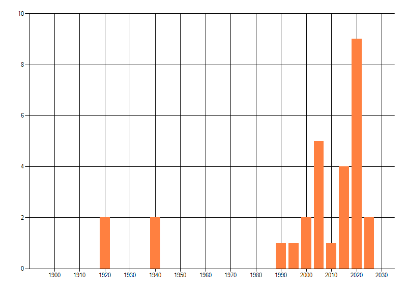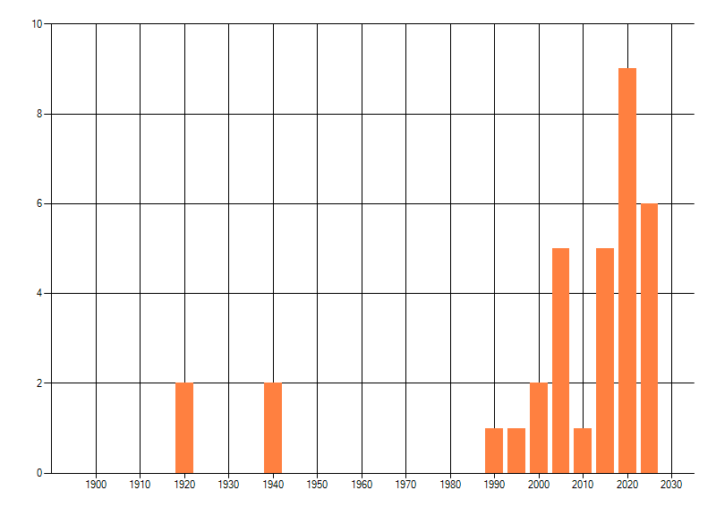 Het aantal atlasblokken (5x5 km) waarin de soort is gemeld binnen een periode van vijf jaar (vanaf 1980) of twintig jaar. Niet gecorrigeerd voor waarnemersinspanning en het aantal doorgegeven waarnemingen kan sterk variëren per periode, dus een trend in verspreiding kan hier niet direct uit worden afgelezen. Het opgegeven jaartal is het eerste jaar van de periode. Bron: gevalideerde waarnemingen uit de NDFF.