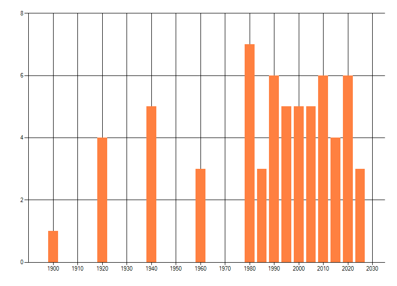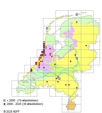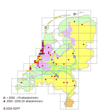 Het aantal atlasblokken (5x5 km) waarin de soort is gemeld binnen een periode van vijf jaar (vanaf 1980) of twintig jaar. Niet gecorrigeerd voor waarnemersinspanning en het aantal doorgegeven waarnemingen kan sterk variëren per periode, dus een trend in verspreiding kan hier niet direct uit worden afgelezen. Het opgegeven jaartal is het eerste jaar van de periode. Bron: gevalideerde waarnemingen uit de NDFF.
