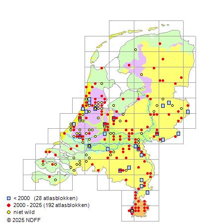 Het aantal atlasblokken (5x5 km) waarin de soort is gemeld binnen een periode van vijf jaar (vanaf 1980) of twintig jaar. Niet gecorrigeerd voor waarnemersinspanning en het aantal doorgegeven waarnemingen kan sterk variëren per periode, dus een trend in verspreiding kan hier niet direct uit worden afgelezen. Het opgegeven jaartal is het eerste jaar van de periode. Bron: gevalideerde waarnemingen uit de NDFF.