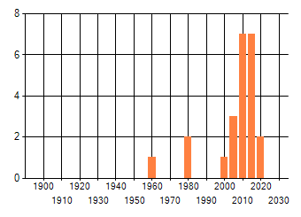 Het aantal atlasblokken (5x5 km) waarin de soort is gemeld binnen een periode van vijf jaar (vanaf 1980) of twintig jaar. Niet gecorrigeerd voor waarnemersinspanning en het aantal doorgegeven waarnemingen kan sterk variëren per periode, dus een trend in verspreiding kan hier niet direct uit worden afgelezen. Het opgegeven jaartal is het eerste jaar van de periode. Bron: gevalideerde waarnemingen uit de NDFF.