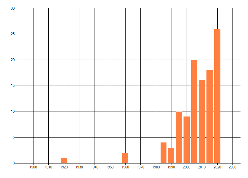 Het aantal atlasblokken (5x5 km) waarin de soort is gemeld binnen een periode van vijf jaar (vanaf 1980) of twintig jaar. Niet gecorrigeerd voor waarnemersinspanning en het aantal doorgegeven waarnemingen kan sterk variëren per periode, dus een trend in verspreiding kan hier niet direct uit worden afgelezen. Het opgegeven jaartal is het eerste jaar van de periode. Bron: gevalideerde waarnemingen uit de NDFF.