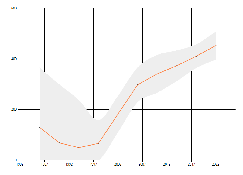 Gemiddelde trend van het aantal kilometerhokken waarin de soort voorkomt, weergegeven als indexcijfer (1975-1978 = 100). De trend is gecorrigeerd voor waarnemersinspanning en geeft de relatieve verandering in het aantal bezette kilometerhokken weer. Voor de berekening worden de data per periode van vier jaar samengenomen. In de grafiek correspondeert ieder punt met het laatste jaar van zo'n periode.