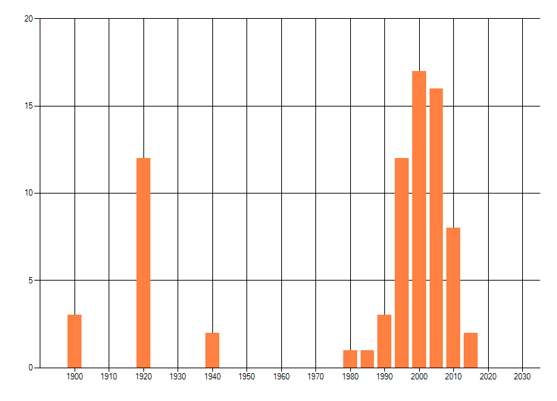Het aantal atlasblokken (5x5 km) waarin de soort is gemeld binnen een periode van vijf jaar (vanaf 1980) of twintig jaar. Niet gecorrigeerd voor waarnemersinspanning en het aantal doorgegeven waarnemingen kan sterk variëren per periode, dus een trend in verspreiding kan hier niet direct uit worden afgelezen. Het opgegeven jaartal is het eerste jaar van de periode. Bron: gevalideerde waarnemingen uit de NDFF.