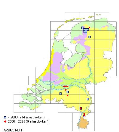 Het aantal atlasblokken (5x5 km) waarin de soort is gemeld binnen een periode van vijf jaar (vanaf 1980) of twintig jaar. Niet gecorrigeerd voor waarnemersinspanning en het aantal doorgegeven waarnemingen kan sterk variëren per periode, dus een trend in verspreiding kan hier niet direct uit worden afgelezen. Het opgegeven jaartal is het eerste jaar van de periode. Bron: gevalideerde waarnemingen uit de NDFF.