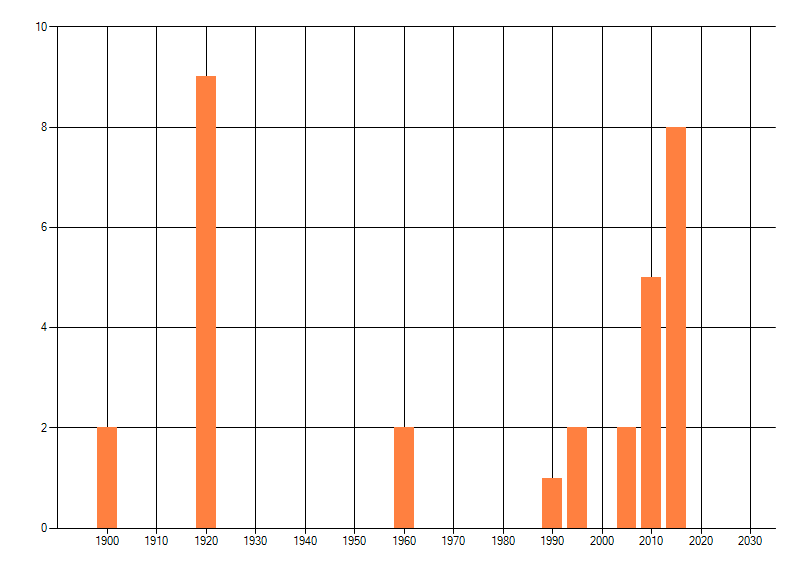 Het aantal atlasblokken (5x5 km) waarin de soort is gemeld binnen een periode van vijf jaar (vanaf 1980) of twintig jaar. Niet gecorrigeerd voor waarnemersinspanning en het aantal doorgegeven waarnemingen kan sterk variëren per periode, dus een trend in verspreiding kan hier niet direct uit worden afgelezen. Het opgegeven jaartal is het eerste jaar van de periode. Bron: gevalideerde waarnemingen uit de NDFF.