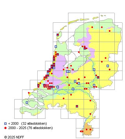Het aantal atlasblokken (5x5 km) waarin de soort is gemeld binnen een periode van vijf jaar (vanaf 1980) of twintig jaar. Niet gecorrigeerd voor waarnemersinspanning en het aantal doorgegeven waarnemingen kan sterk variëren per periode, dus een trend in verspreiding kan hier niet direct uit worden afgelezen. Het opgegeven jaartal is het eerste jaar van de periode. Bron: gevalideerde waarnemingen uit de NDFF.