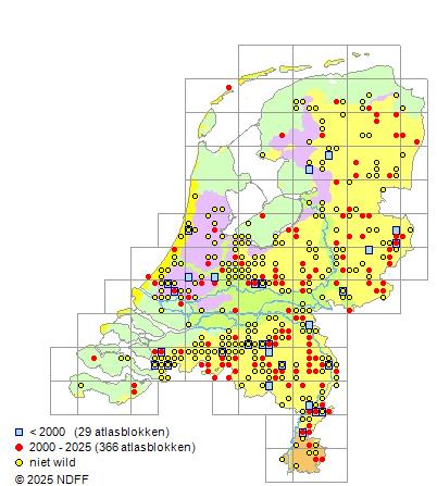 Het aantal atlasblokken (5x5 km) waarin de soort is gemeld binnen een periode van vijf jaar (vanaf 1980) of twintig jaar. Niet gecorrigeerd voor waarnemersinspanning en het aantal doorgegeven waarnemingen kan sterk variëren per periode, dus een trend in verspreiding kan hier niet direct uit worden afgelezen. Het opgegeven jaartal is het eerste jaar van de periode. Bron: gevalideerde waarnemingen uit de NDFF.