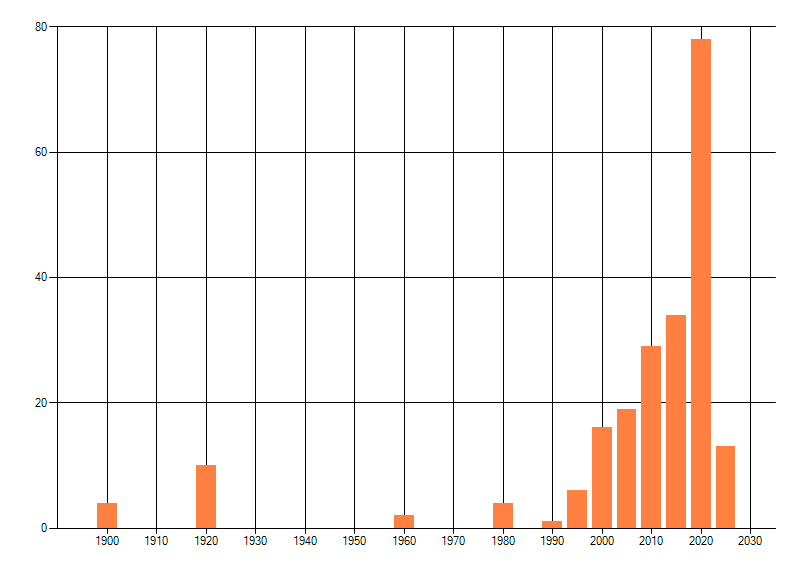 Het aantal atlasblokken (5x5 km) waarin de soort is gemeld binnen een periode van vijf jaar (vanaf 1980) of twintig jaar. Niet gecorrigeerd voor waarnemersinspanning en het aantal doorgegeven waarnemingen kan sterk variëren per periode, dus een trend in verspreiding kan hier niet direct uit worden afgelezen. Het opgegeven jaartal is het eerste jaar van de periode. Bron: gevalideerde waarnemingen uit de NDFF.