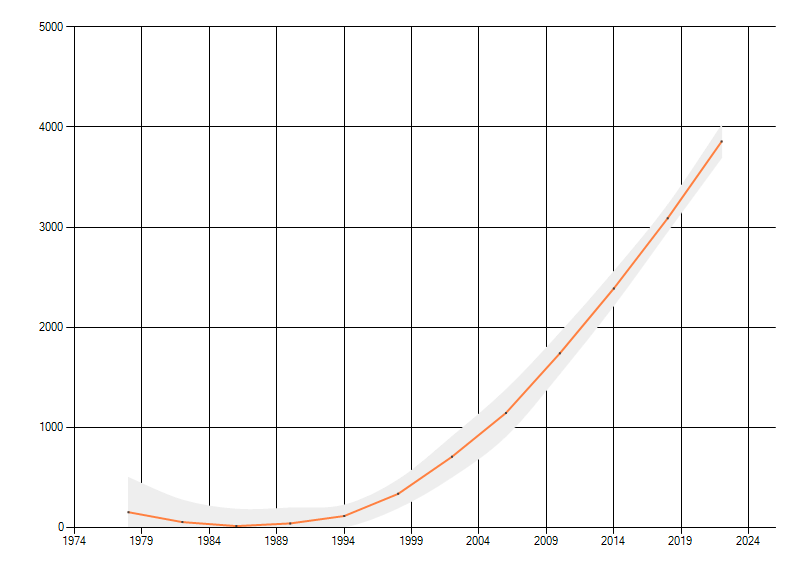 In de grafiek correspondeert ieder punt met het laatste jaar van zo'n periode.