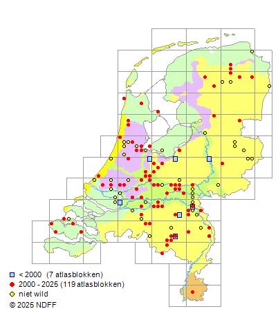 Het aantal atlasblokken (5x5 km) waarin de soort is gemeld binnen een periode van vijf jaar (vanaf 1980) of twintig jaar. Niet gecorrigeerd voor waarnemersinspanning en het aantal doorgegeven waarnemingen kan sterk variëren per periode, dus een trend in verspreiding kan hier niet direct uit worden afgelezen. Het opgegeven jaartal is het eerste jaar van de periode. Bron: gevalideerde waarnemingen uit de NDFF.