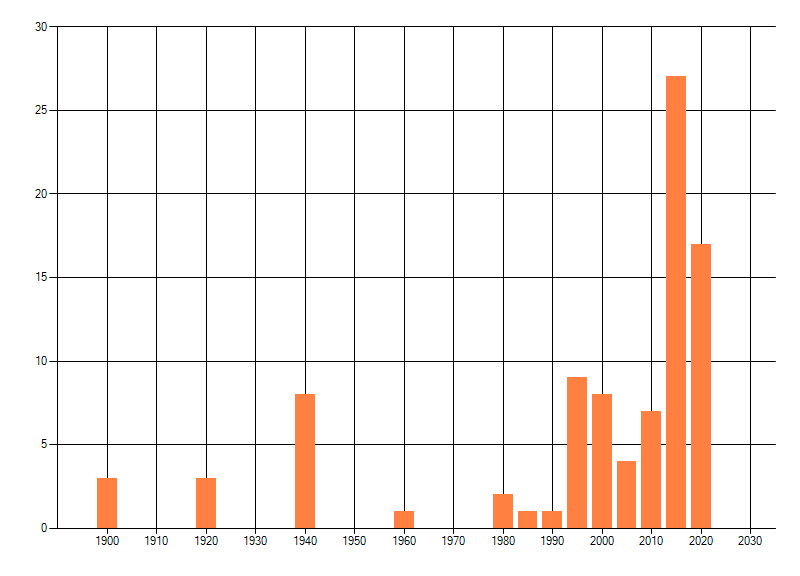 Het aantal atlasblokken (5x5 km) waarin de soort is gemeld binnen een periode van vijf jaar (vanaf 1980) of twintig jaar. Niet gecorrigeerd voor waarnemersinspanning en het aantal doorgegeven waarnemingen kan sterk variëren per periode, dus een trend in verspreiding kan hier niet direct uit worden afgelezen. Het opgegeven jaartal is het eerste jaar van de periode. Bron: gevalideerde waarnemingen uit de NDFF.
