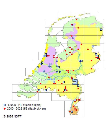 Het aantal atlasblokken (5x5 km) waarin de soort is gemeld binnen een periode van vijf jaar (vanaf 1980) of twintig jaar. Niet gecorrigeerd voor waarnemersinspanning en het aantal doorgegeven waarnemingen kan sterk variëren per periode, dus een trend in verspreiding kan hier niet direct uit worden afgelezen. Het opgegeven jaartal is het eerste jaar van de periode. Bron: gevalideerde waarnemingen uit de NDFF.