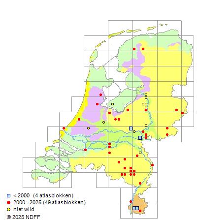 Het aantal atlasblokken (5x5 km) waarin de soort is gemeld binnen een periode van vijf jaar (vanaf 1980) of twintig jaar. Niet gecorrigeerd voor waarnemersinspanning en het aantal doorgegeven waarnemingen kan sterk variëren per periode, dus een trend in verspreiding kan hier niet direct uit worden afgelezen. Het opgegeven jaartal is het eerste jaar van de periode. Bron: gevalideerde waarnemingen uit de NDFF.