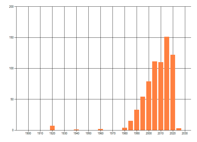 Het aantal atlasblokken (5x5 km) waarin de soort is gemeld binnen een periode van vijf jaar (vanaf 1980) of twintig jaar. Niet gecorrigeerd voor waarnemersinspanning en het aantal doorgegeven waarnemingen kan sterk variëren per periode, dus een trend in verspreiding kan hier niet direct uit worden afgelezen. Het opgegeven jaartal is het eerste jaar van de periode. Bron: gevalideerde waarnemingen uit de NDFF.