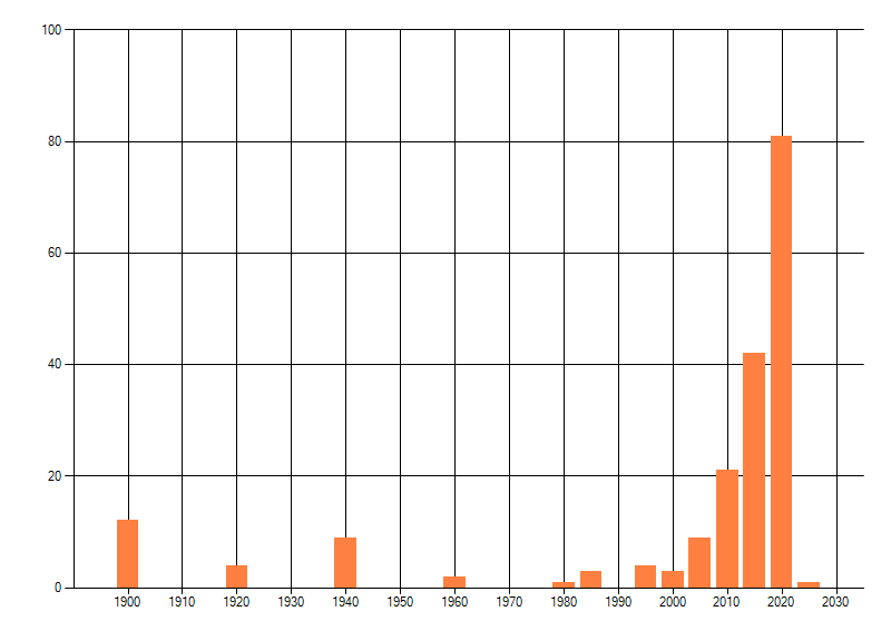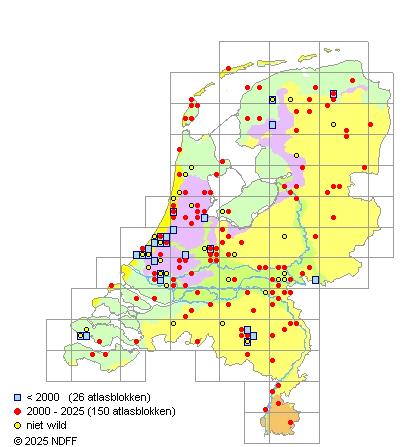 Het aantal atlasblokken (5x5 km) waarin de soort is gemeld binnen een periode van vijf jaar (vanaf 1980) of twintig jaar. Niet gecorrigeerd voor waarnemersinspanning en het aantal doorgegeven waarnemingen kan sterk variëren per periode, dus een trend in verspreiding kan hier niet direct uit worden afgelezen. Het opgegeven jaartal is het eerste jaar van de periode. Bron: gevalideerde waarnemingen uit de NDFF.
