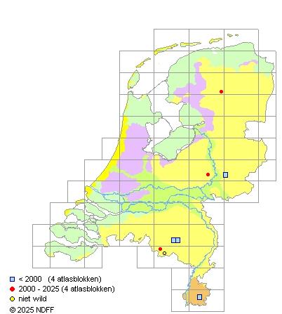 Het aantal atlasblokken (5x5 km) waarin de soort is gemeld binnen een periode van vijf jaar (vanaf 1980) of twintig jaar. Niet gecorrigeerd voor waarnemersinspanning en het aantal doorgegeven waarnemingen kan sterk variëren per periode, dus een trend in verspreiding kan hier niet direct uit worden afgelezen. Het opgegeven jaartal is het eerste jaar van de periode. Bron: gevalideerde waarnemingen uit de NDFF.