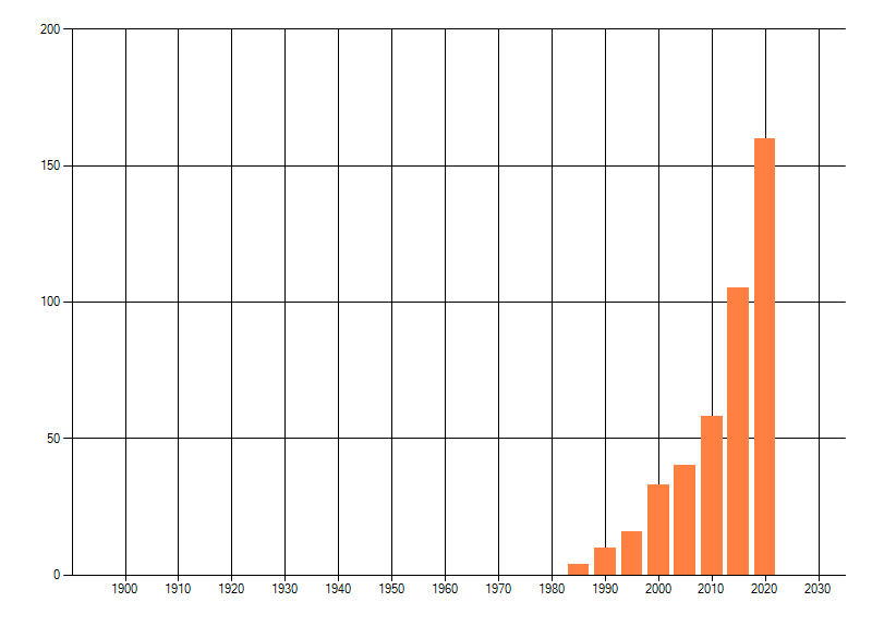 Het aantal atlasblokken (5x5 km) waarin de soort is gemeld binnen een periode van vijf jaar (vanaf 1980) of twintig jaar. Niet gecorrigeerd voor waarnemersinspanning en het aantal doorgegeven waarnemingen kan sterk variëren per periode, dus een trend in verspreiding kan hier niet direct uit worden afgelezen. Het opgegeven jaartal is het eerste jaar van de periode. Bron: gevalideerde waarnemingen uit de NDFF.