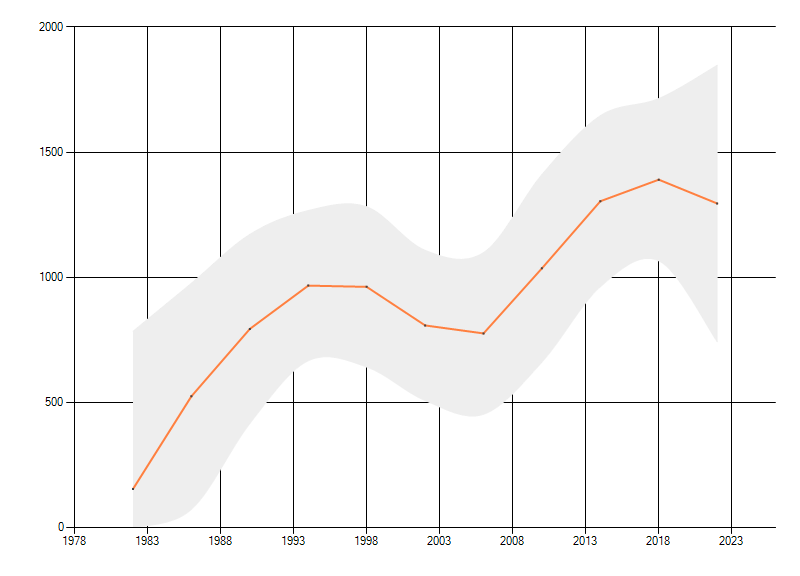 Gemiddelde trend van het aantal kilometerhokken waarin de soort voorkomt, weergegeven als indexcijfer (1975-1978 = 100). De trend is gecorrigeerd voor waarnemersinspanning en geeft de relatieve verandering in het aantal bezette kilometerhokken weer. Voor de berekening worden de data per periode van vier jaar samengenomen. In de grafiek correspondeert ieder punt met het laatste jaar van zo'n periode.
