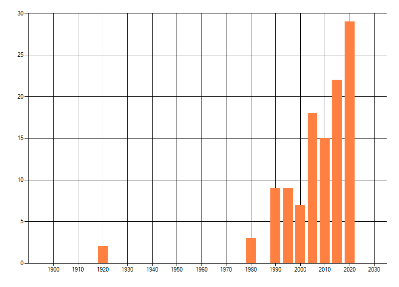 Het aantal atlasblokken (5x5 km) waarin de soort is gemeld binnen een periode van vijf jaar (vanaf 1980) of twintig jaar. Niet gecorrigeerd voor waarnemersinspanning en het aantal doorgegeven waarnemingen kan sterk variëren per periode, dus een trend in verspreiding kan hier niet direct uit worden afgelezen. Het opgegeven jaartal is het eerste jaar van de periode. Bron: gevalideerde waarnemingen uit de NDFF.