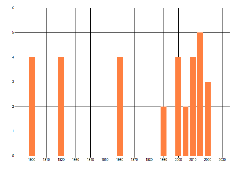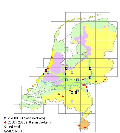 Het aantal atlasblokken (5x5 km) waarin de soort is gemeld binnen een periode van vijf jaar (vanaf 1980) of twintig jaar. Niet gecorrigeerd voor waarnemersinspanning en het aantal doorgegeven waarnemingen kan sterk variëren per periode, dus een trend in verspreiding kan hier niet direct uit worden afgelezen. Het opgegeven jaartal is het eerste jaar van de periode. Bron: gevalideerde waarnemingen uit de NDFF.